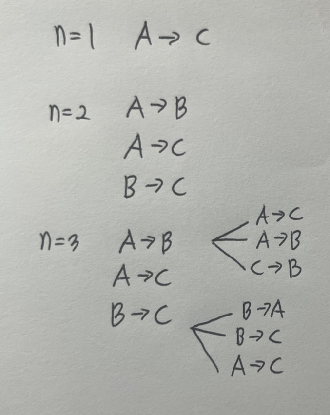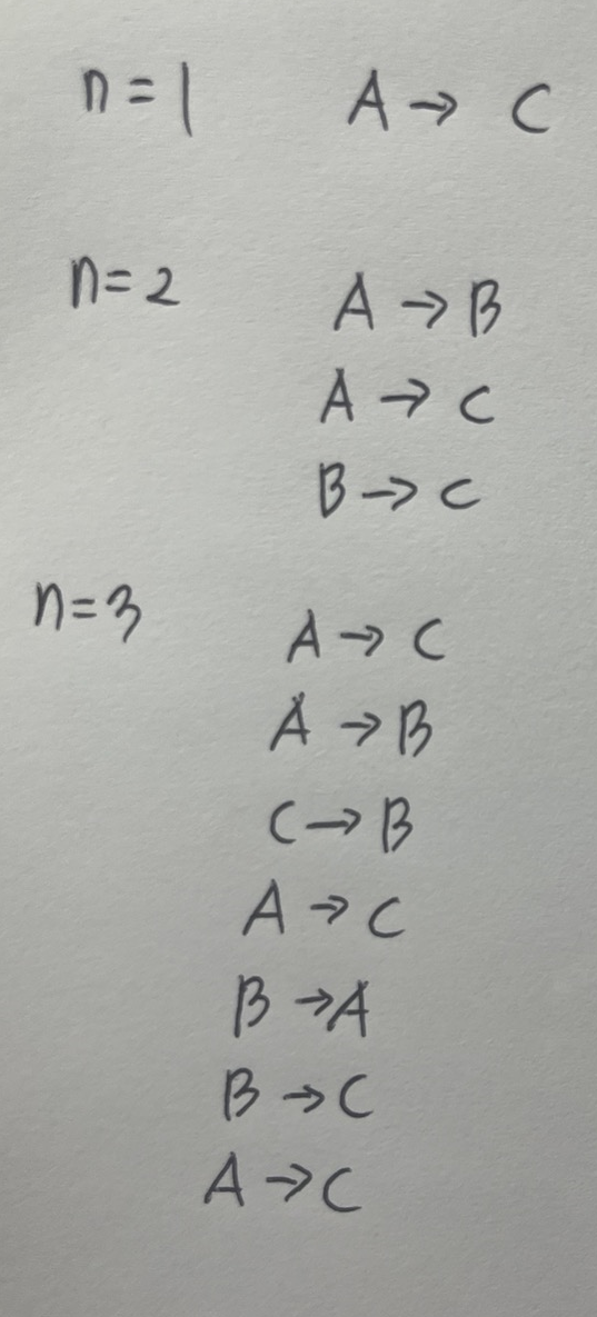 먼저 원반 3개로 가정했을 때 맨 위에 있는 원반을 A에서 C로 옮기고 가운데 원반은 A에서 B로 옮긴 후