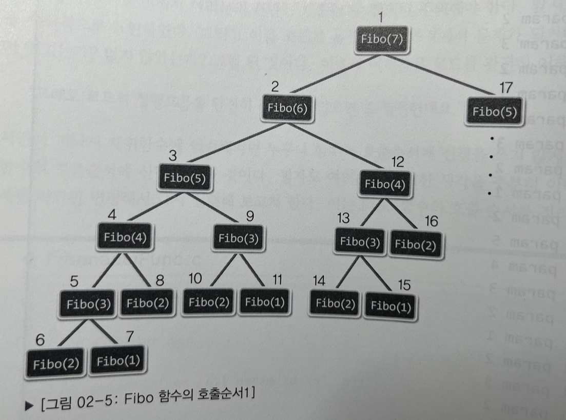 다음과 같은 식이 있을 때 + 연산자 왼쪽에 있는 fibo 함수호출이 완료되어야 비로소 + 오른쪽에 있는 fibo 함수호출이 실행된다.