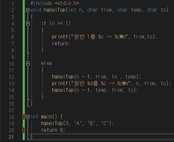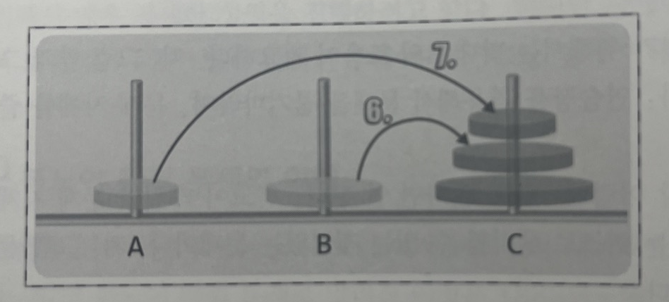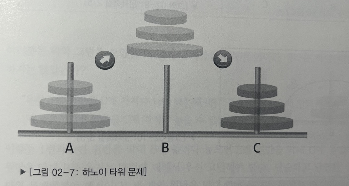 하노이 타워 문제는 A에 있는 원반들을 모두 C로 옮기는데 이 때 원반은 하나씩만 옮길 수 있으며 옮기는 과정에서 작은 원반 위에 큰 원반이 올려져서는 안된다.