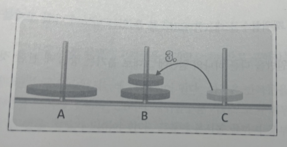 3. 작은 원반 n-1개를 B에서 C로 이동
