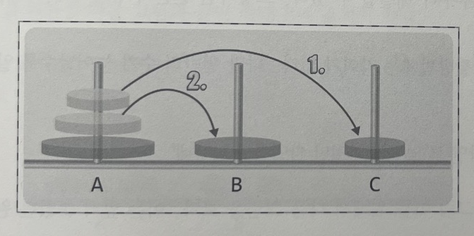 1. 작은 원반 2개(맨 아래 원반 제외)를 A에서 B로 이동