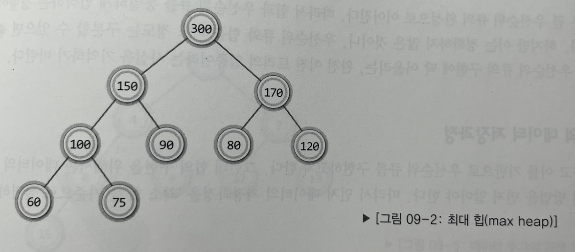 위 트리처럼 루트 노드로 올라갈수록 저장된 값이 커지는 완전 이진 트리를 가리켜 최대 힙이라 한다.