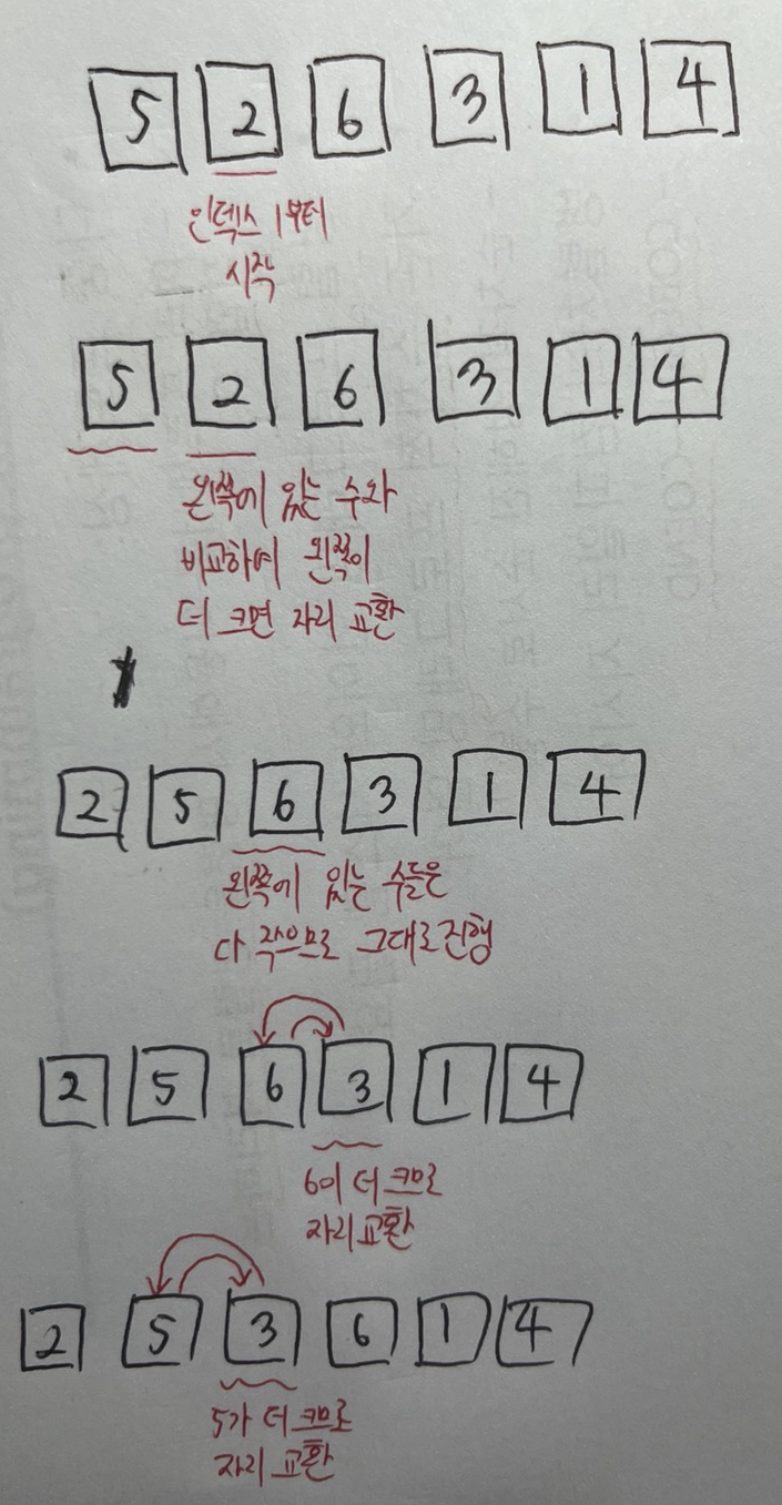 삽입 정렬이란 배열의 두 번째 인덱스부터 시작하여 그 앞의 인덱스가 클 경우 그 인덱스가 위치한 곳에 삽입하여 정렬하는 방식이다.