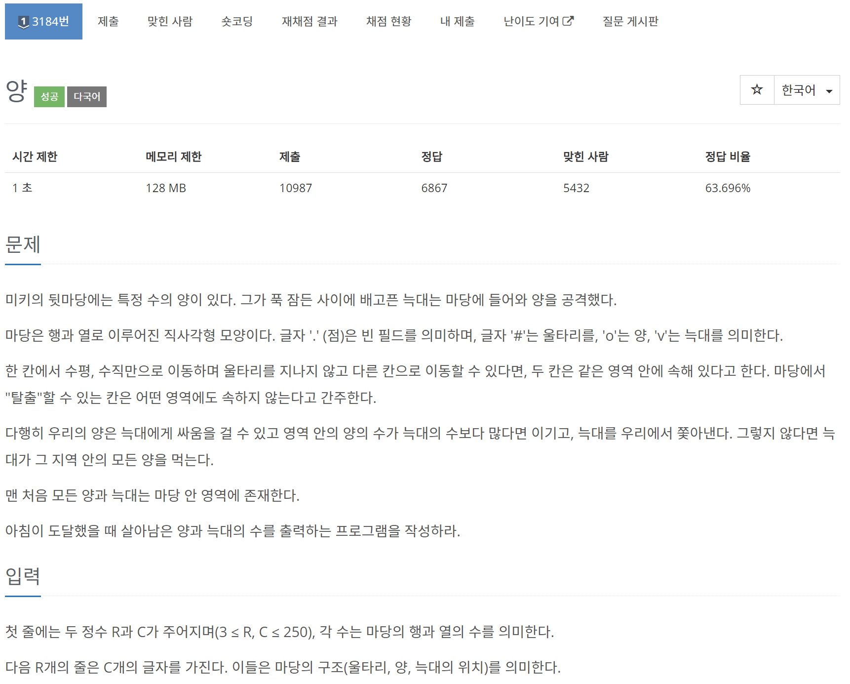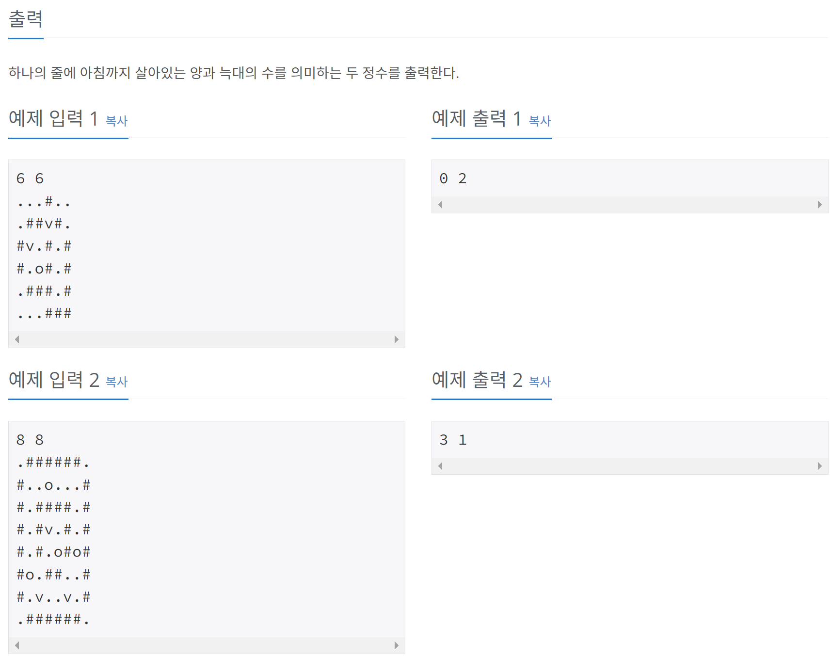 static int R, C, wolf, sheep, wolf_ans, sheep_ans;