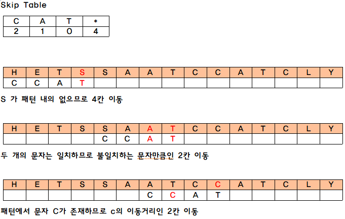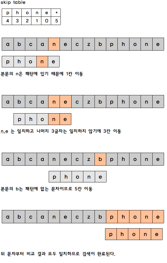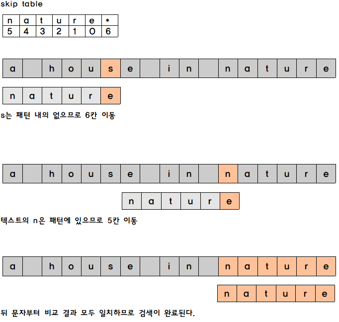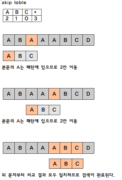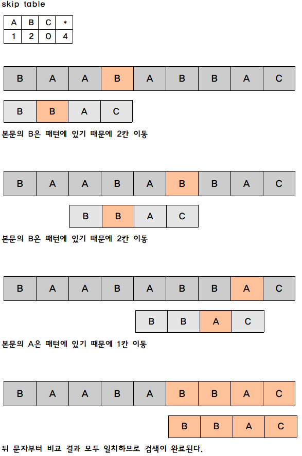 ⦁ 전체 문자열과 패턴을 비교 시 문자열의 뒷부분부터 비교하고 다르면 일정 길이만큼 이동한다.
