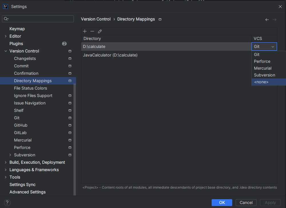 3. Setting -> Version Control -> Directory Mappings -> VCS 를 None 으로 변경