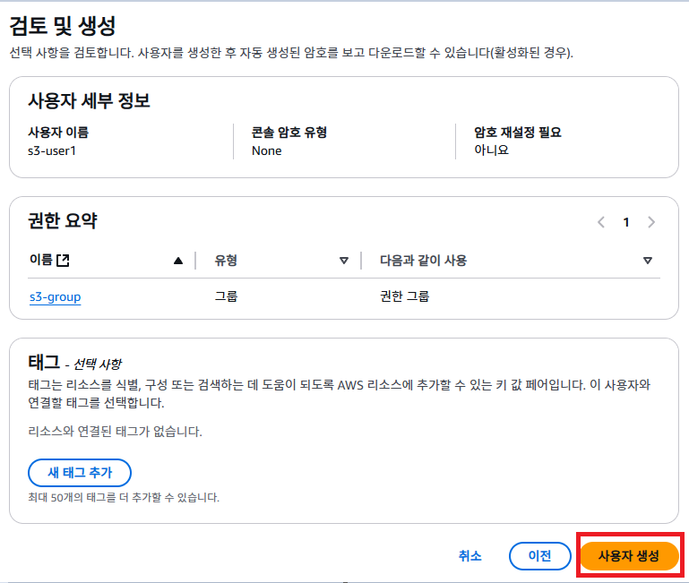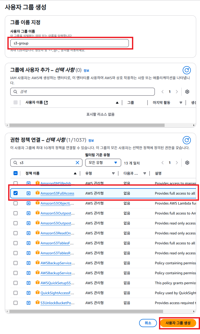 4. 사용자 그룹 이름 지정 및 S3 권한 부여