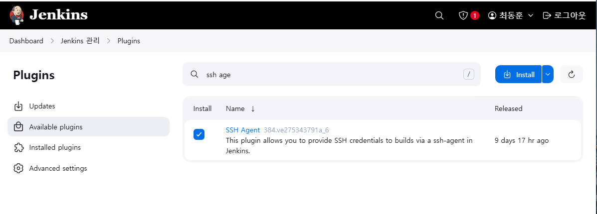 10-3. Plugins -> Available plugins -> ssh agent 검색 후 플러그인 설치