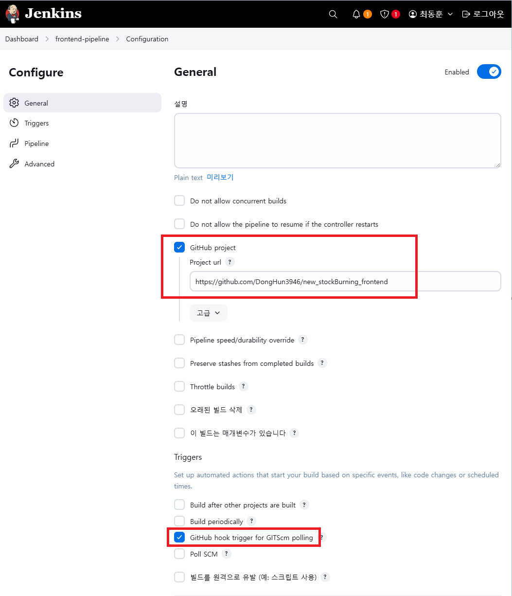 9-2. 파이프라인 생성 후 General 에서 Github project 에 프론트 코드가 담겨있는 깃허브 주소 입력