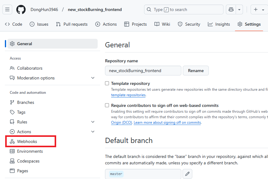 8-6. 다시 웹훅을 적용한 리포지터리에 들어가서 Settings의 Webhook 클릭