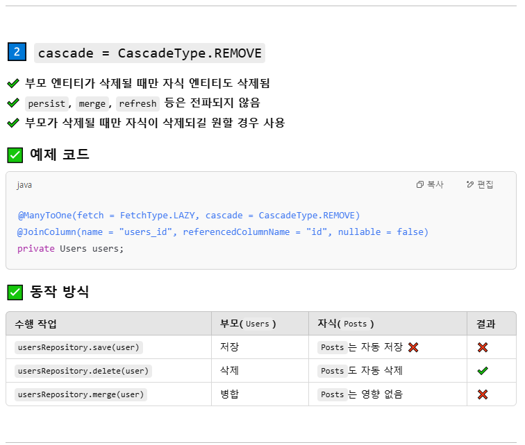 추가적으로 @ManyToOne에는 cascade = CascadeType.REMOVE 사용하면 안됨
