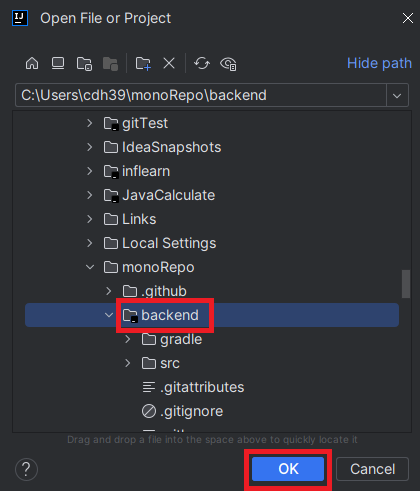 9. 인텔리제이에서 backend 폴더 선택 후 OK 클릭