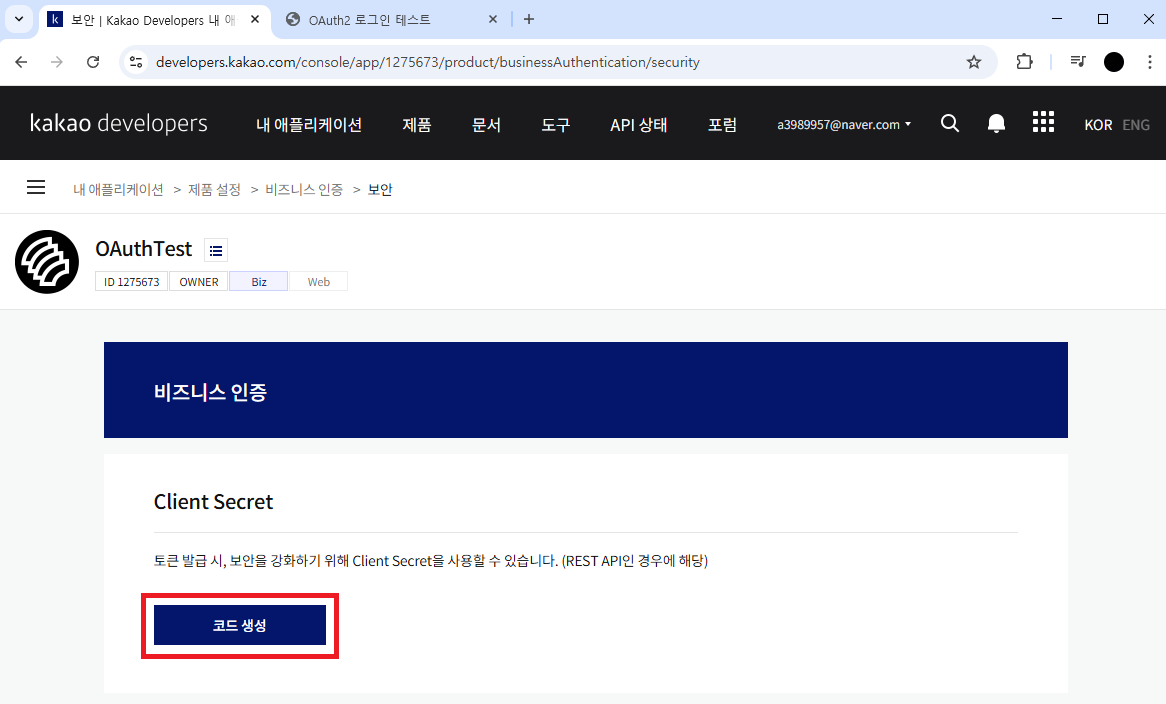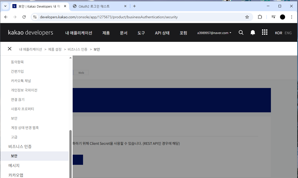 7. 비즈니스 인증에 보안을 클릭한 뒤