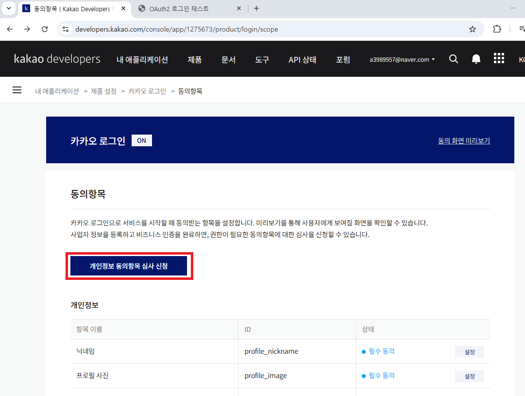18. 만약 카카오 계정(이메일), 이름, 성별 등 다른 항목들을 동의받으려면 개인정보 동의항목 심사 신청을 클릭한다.