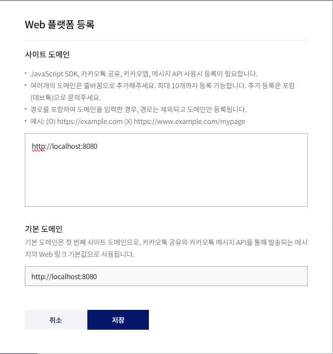 11. Web 플랫폼 등록 클릭 후 본인의 사이트 도메인을 입력 후 저장한다.