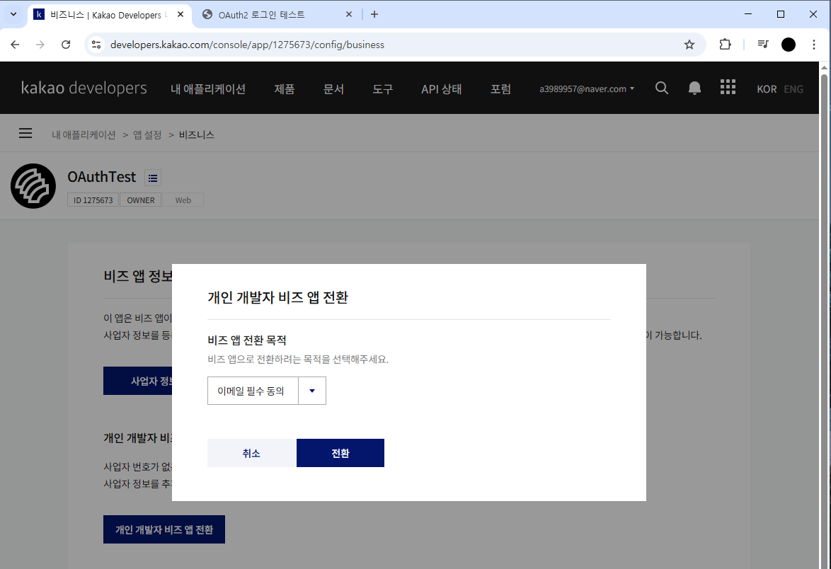 19. 그 다음 [개인 개발자 비즈 앱 전환] 을 클릭한다.